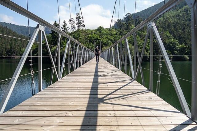 La Ruta del Puente Colgante parte del Área Recreativa de Folgueiróu, situada junto a la carretera AS-12, y desciende por una pista amplia y bien conservada hacia el Embalse de Doiras. A lo largo de este tramo se atraviesan bosques de pinos, robles, castaños y abedules, acompañados por extensas manchas de helechos y brezos que aportan color y aroma al paisaje.